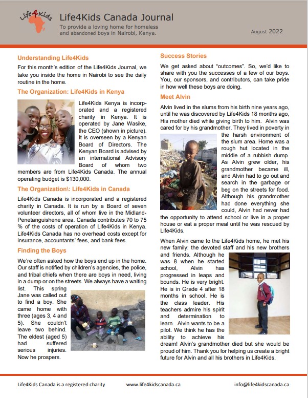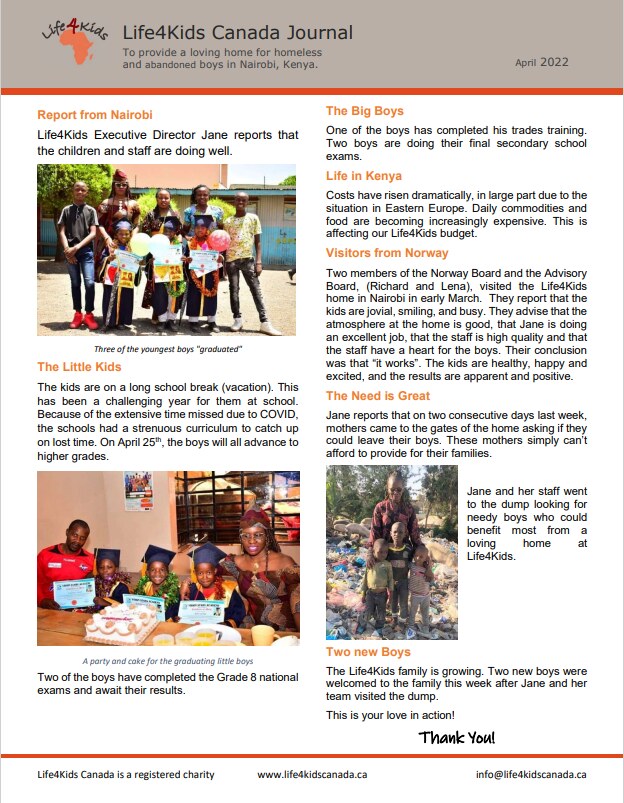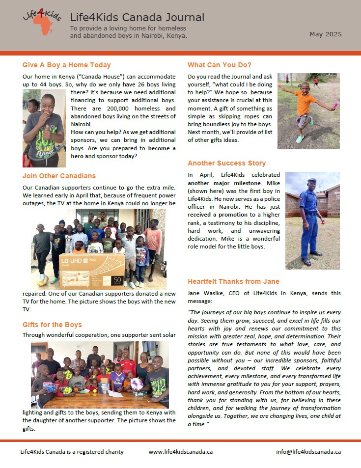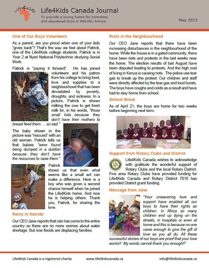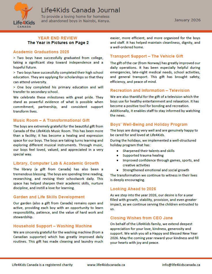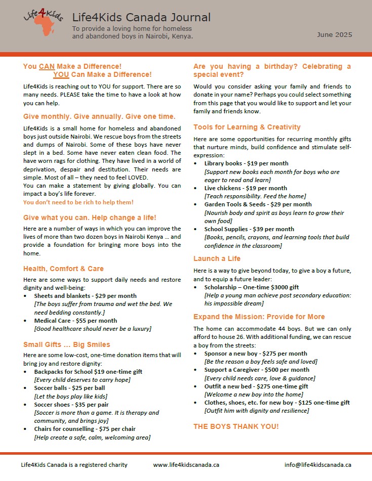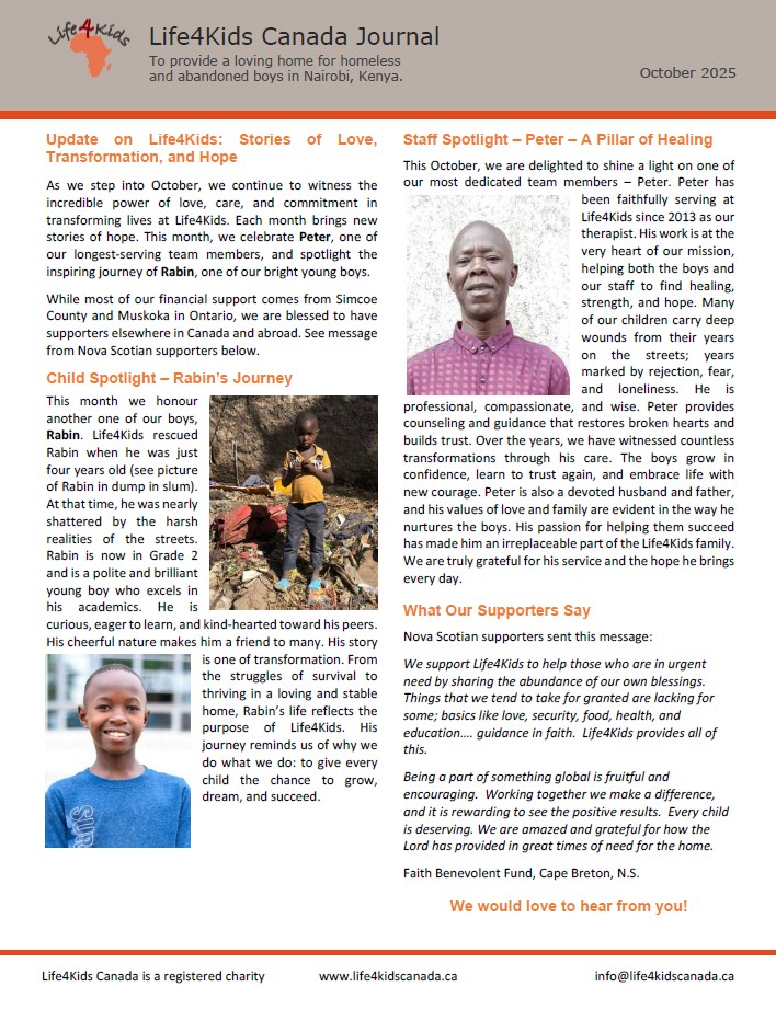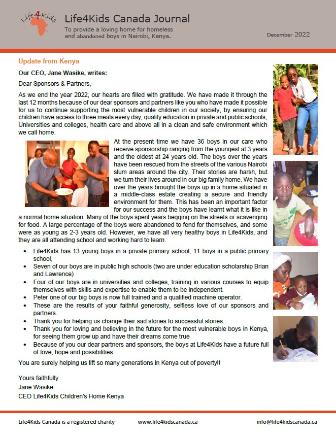 Each month we publish and circulate a newsletter about life at the home in Kenya: successes, challenges, individual stories of boys, stories about staff, comments from our Executive Director, and more.