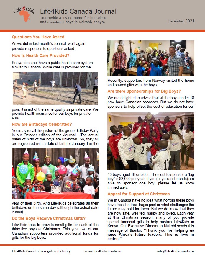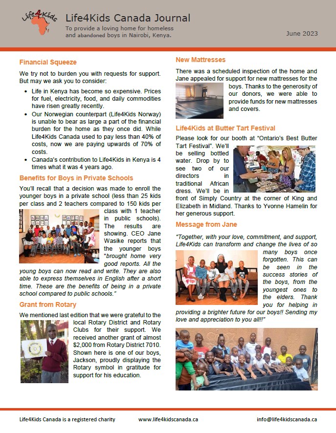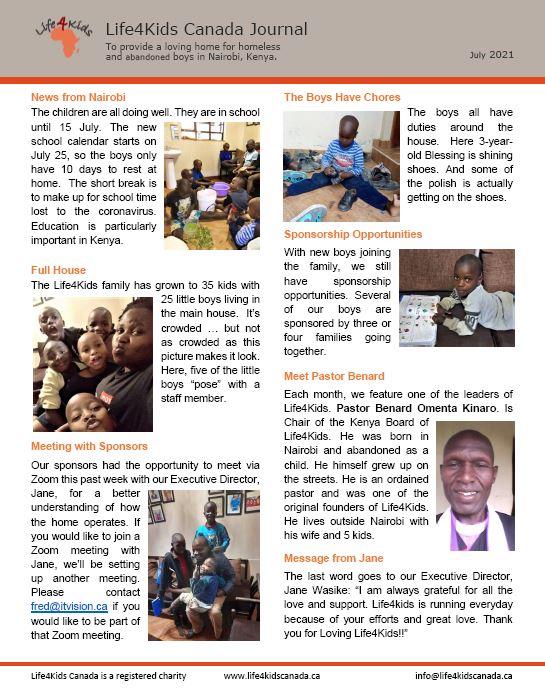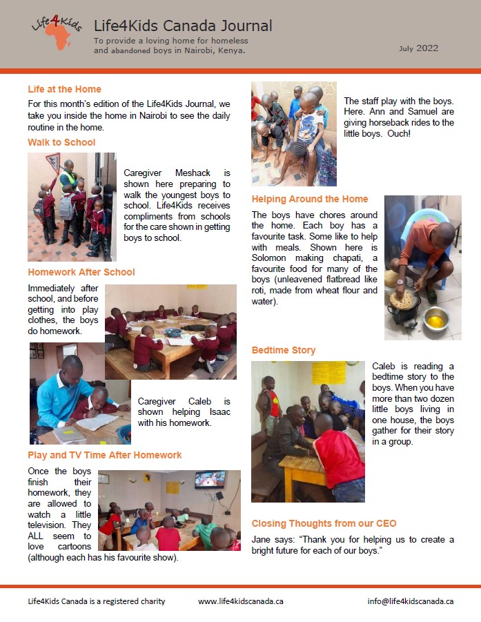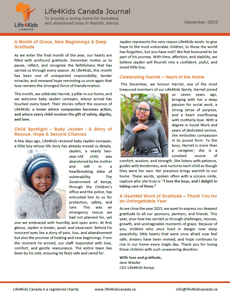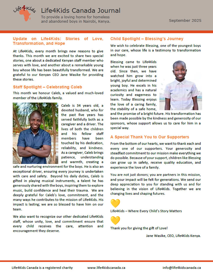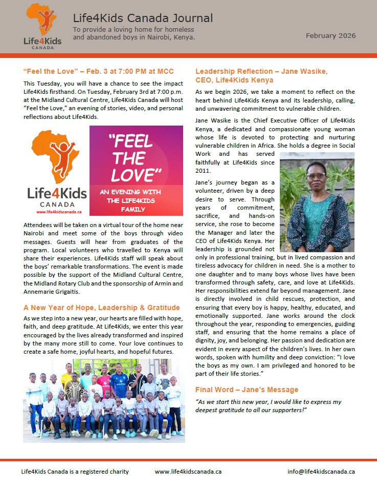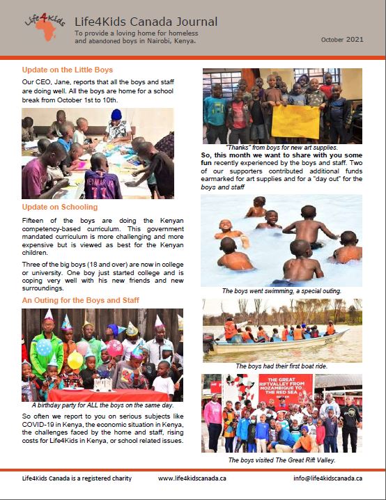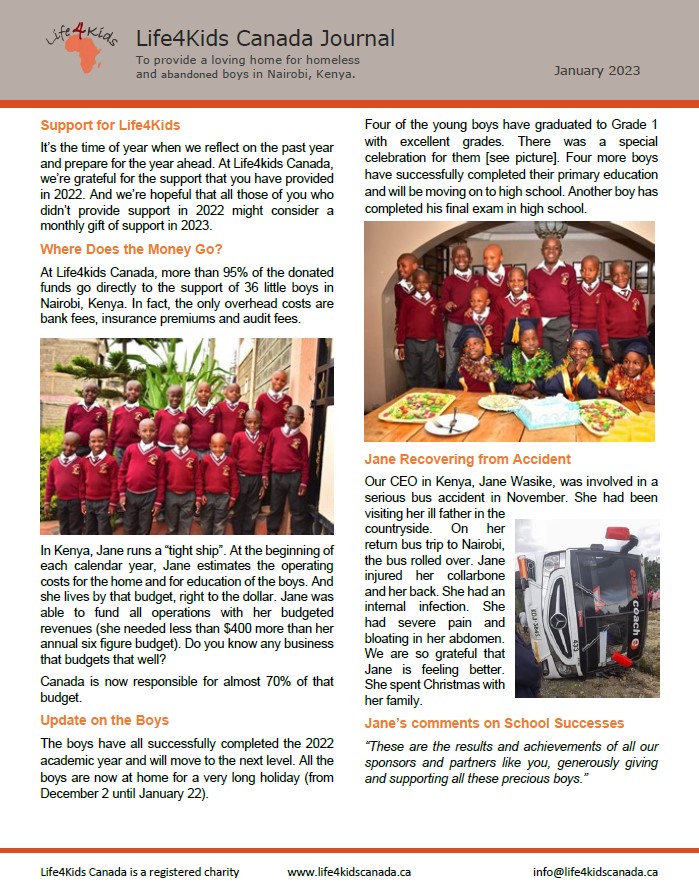 Each month we publish and circulate a newsletter about life at the home in Kenya: successes, challenges, individual stories of boys, stories about staff, comments from our Executive Director, and more.