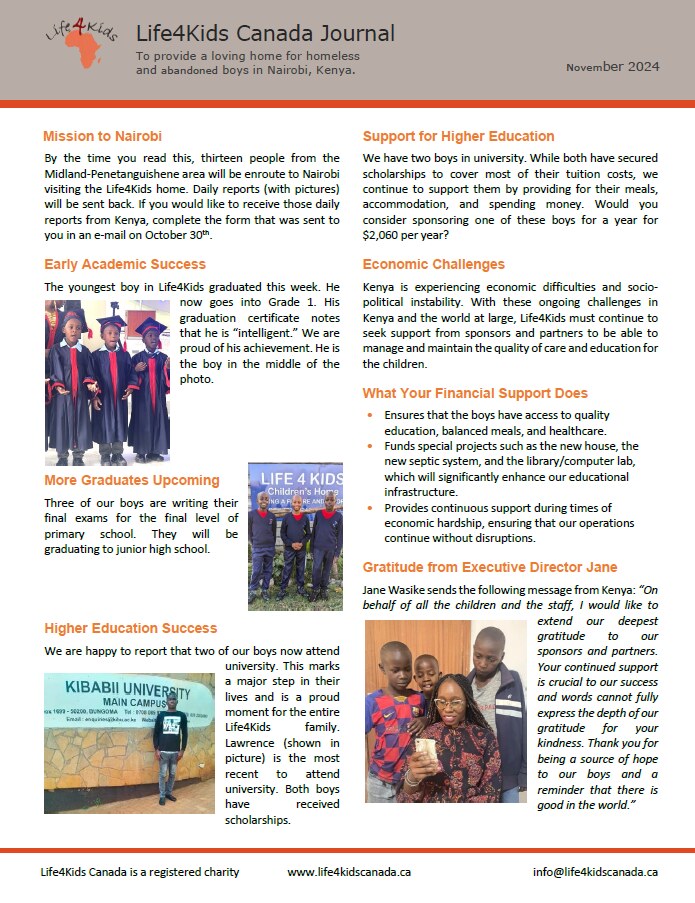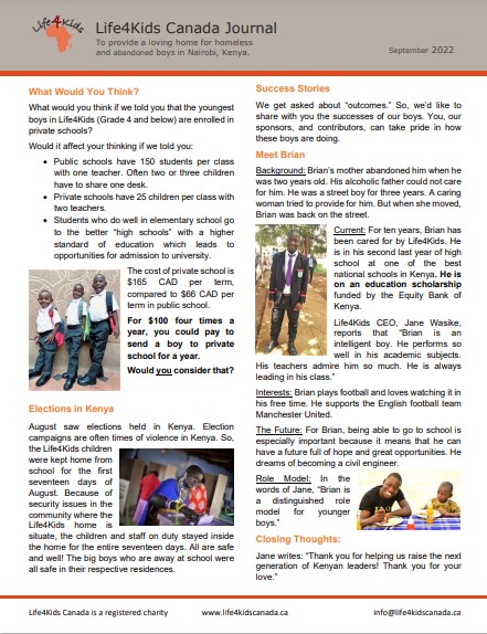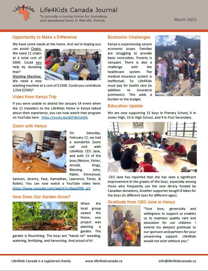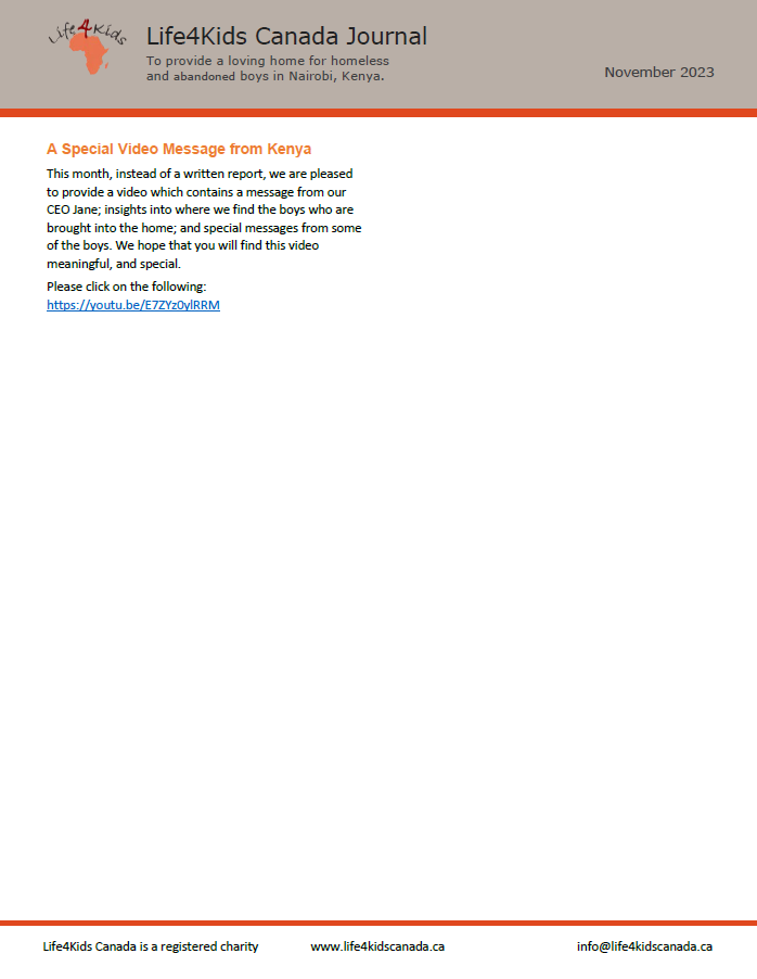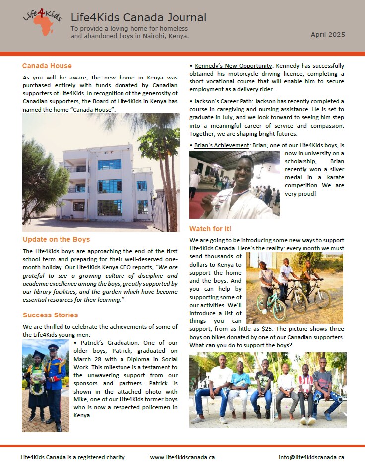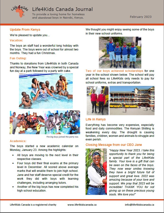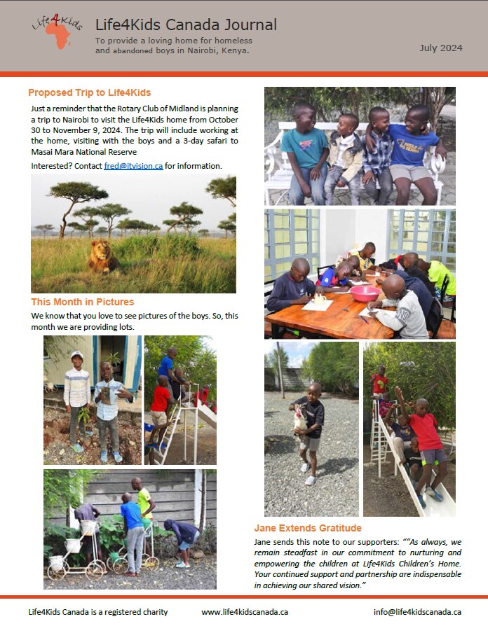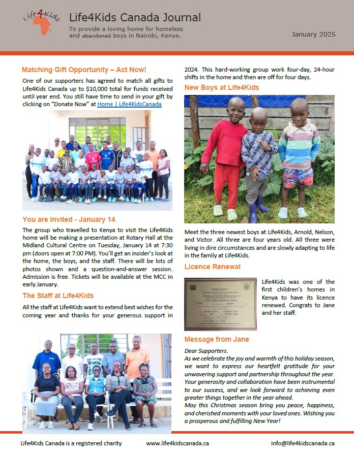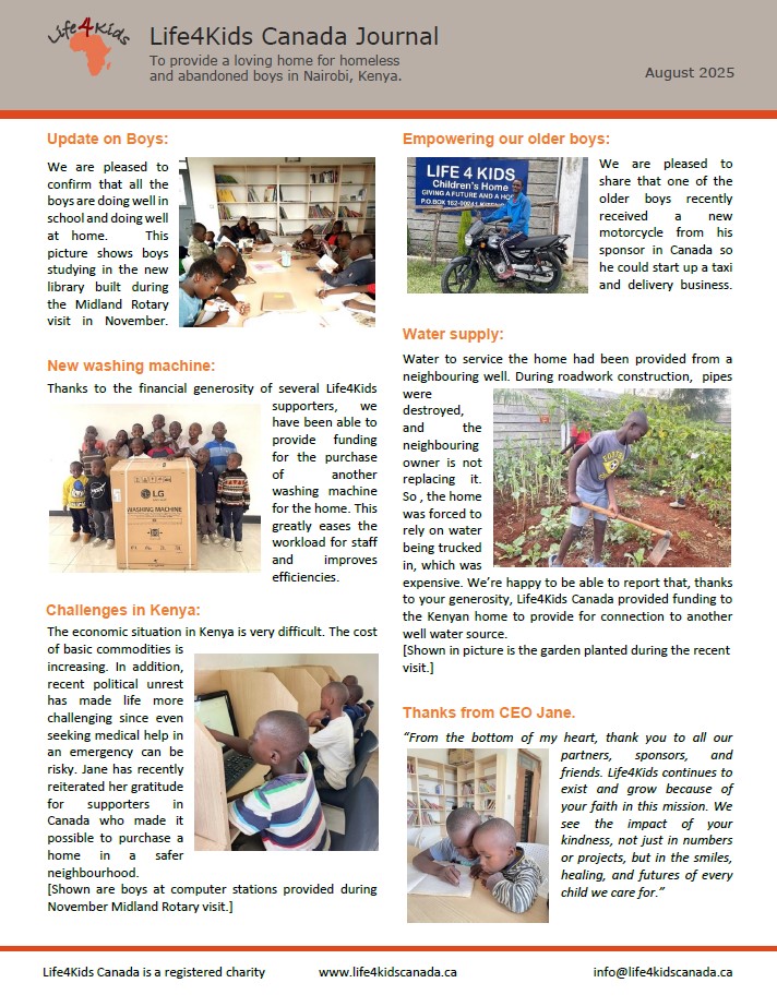 Each month we publish and circulate a newsletter about life at the home in Kenya: successes, challenges, individual stories of boys, stories about staff, comments from our Executive Director, and more.