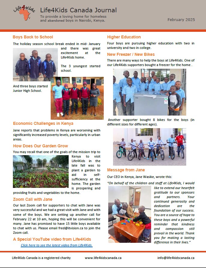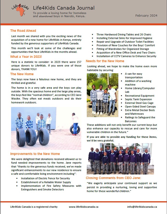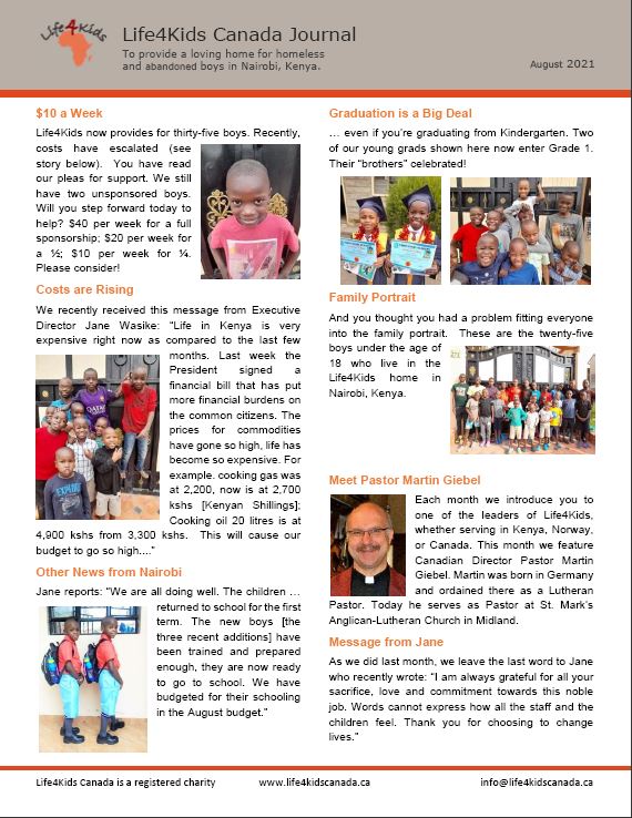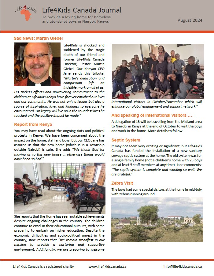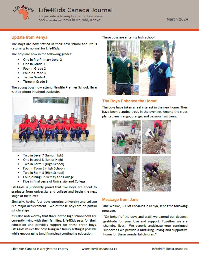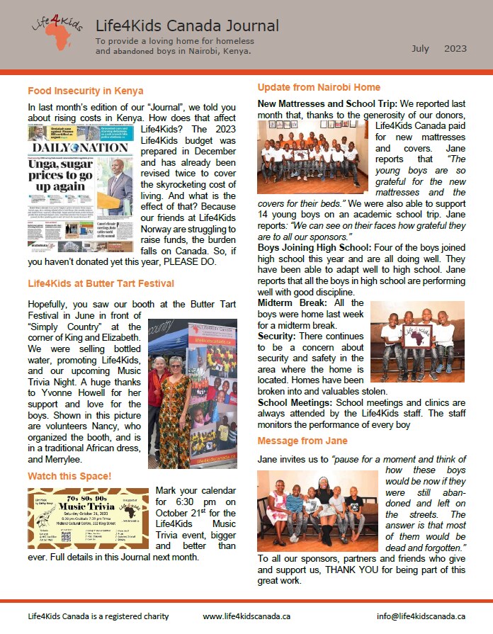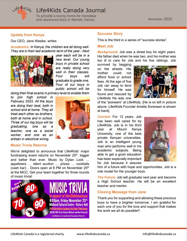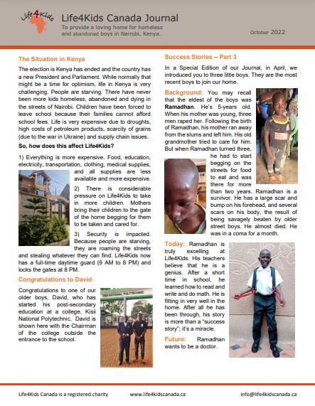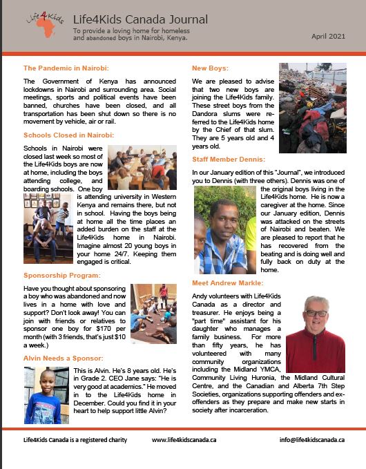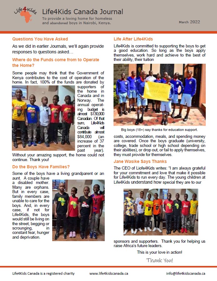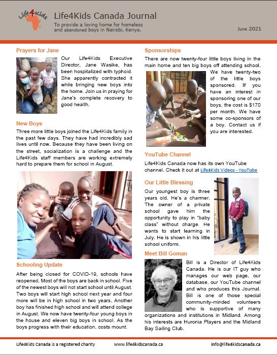 Each month we publish and circulate a newsletter about life at the home in Kenya: successes, challenges, individual stories of boys, stories about staff, comments from our Executive Director, and more.