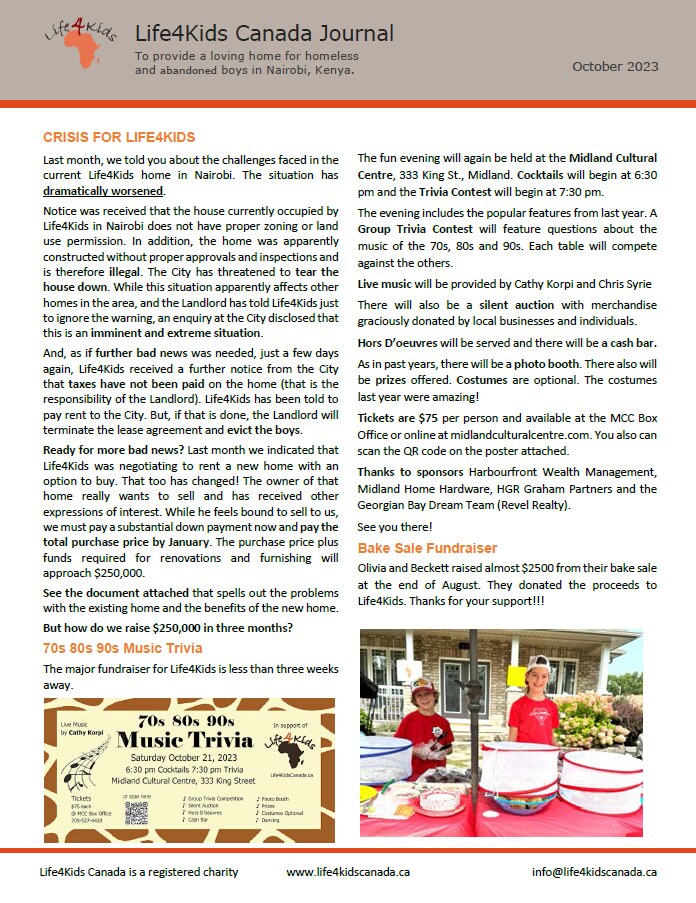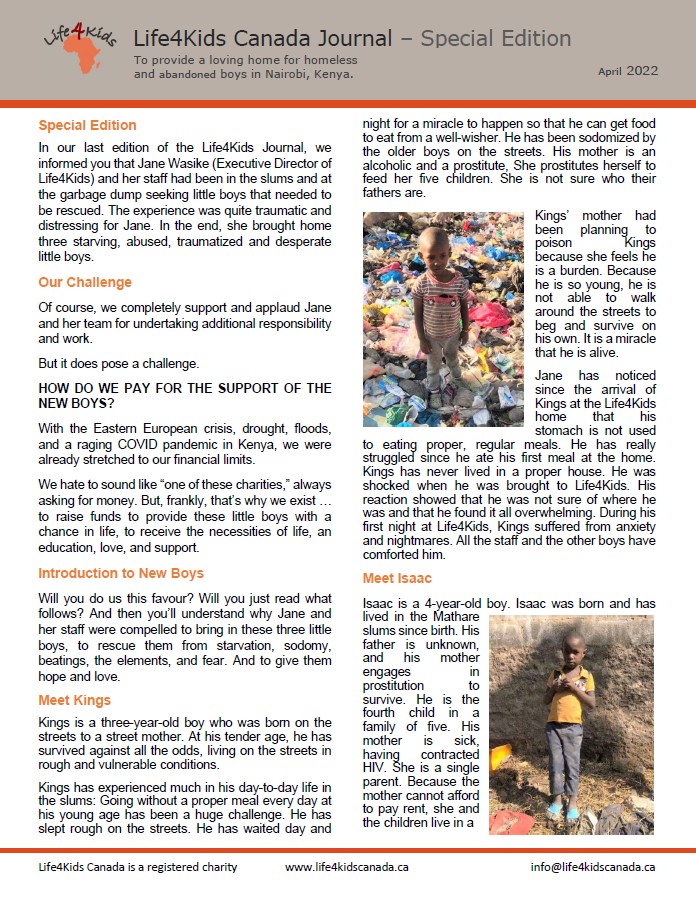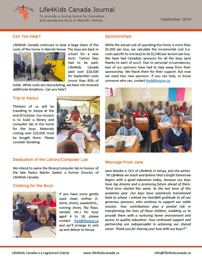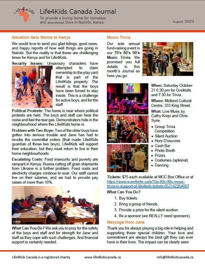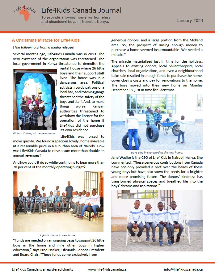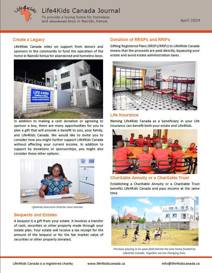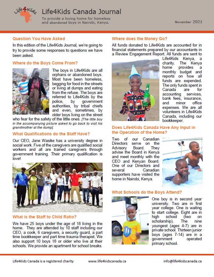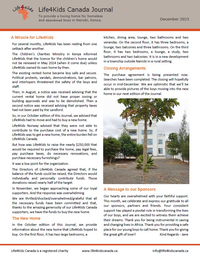 Each month we publish and circulate a newsletter about life at the home in Kenya: successes, challenges, individual stories of boys, stories about staff, comments from our Executive Director, and more.